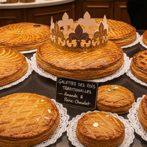 Notre sélection de galettes faites maison par notre maître artisan : à la Frangipane, aux Pommes avec morceaux et à la Poire-Miel-Chocolat.